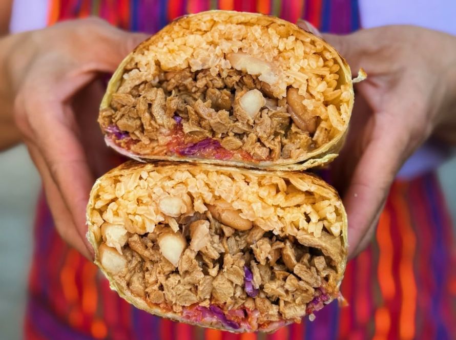 Flour tortilla, plant-based protein of choice, beans (whole or refried) rice, pico de gallo, cabbage, and chipotle crema. Plant-Based Protein AsadaChikinJackfruit CarnitasChunk Plant-BasedAl PastorBistec a La Mexicana